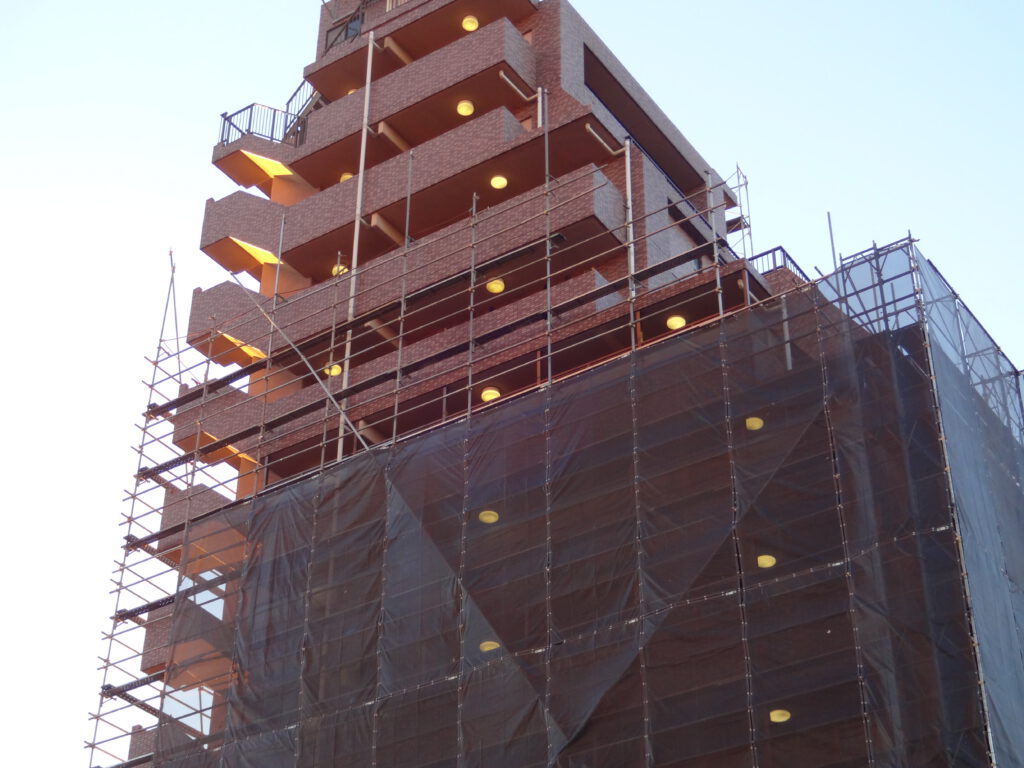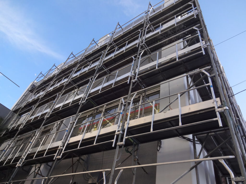 中・高層向けの資材で特に強度・耐久性に優れ、組立て・解体も比較的に容易で、抜群の安定感を出せるため、中・高層に多く用いられております。